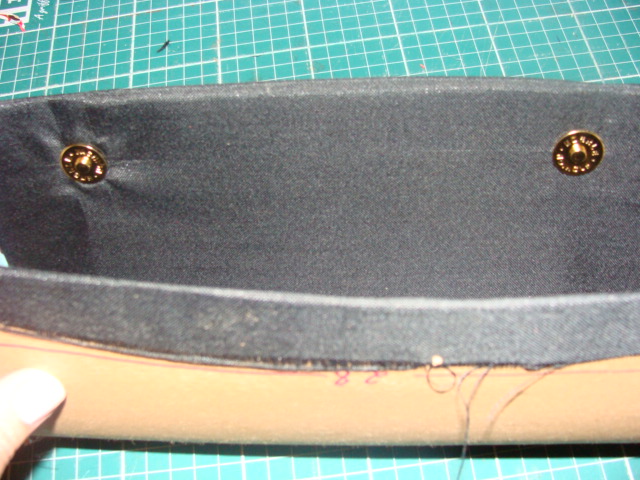 Botões colocados.Sempre coloque primeiro a parte do botão que tem o pino (macho).Por que assim podemos marcar do outro lado e colocar a fêmea.Você pinta com uma canetinha o pininho e depois encosta no outro lado da bolsa, assim ficará marcado onde deve colocar a outra parte do botão (fêmea).